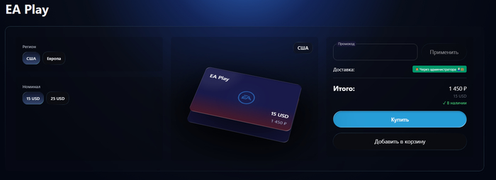 Выберите номинал подарочной карты под нужный период. Для месячной подписки EA Play берите карту с запасом на стоимость месяца, для годовой — номинал который покроет полную сумму годового тарифа. Годовая еа плей подписка выгоднее при стабильном использовании — один раз пополнили баланс и оформили на год вперёд.