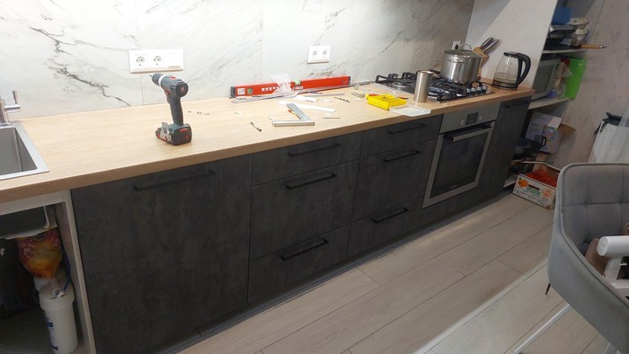 Что касается величины промежутка между фасадами — 2 мм. Это моё личное решение. Обычно делают 3–4 мм: при большем зазоре гораздо легче отрегулировать фасады. Чем меньше зазор — тем сложнее, но визуально смотрится лучше, имхо. Для интереса — померьте на своей кухне.