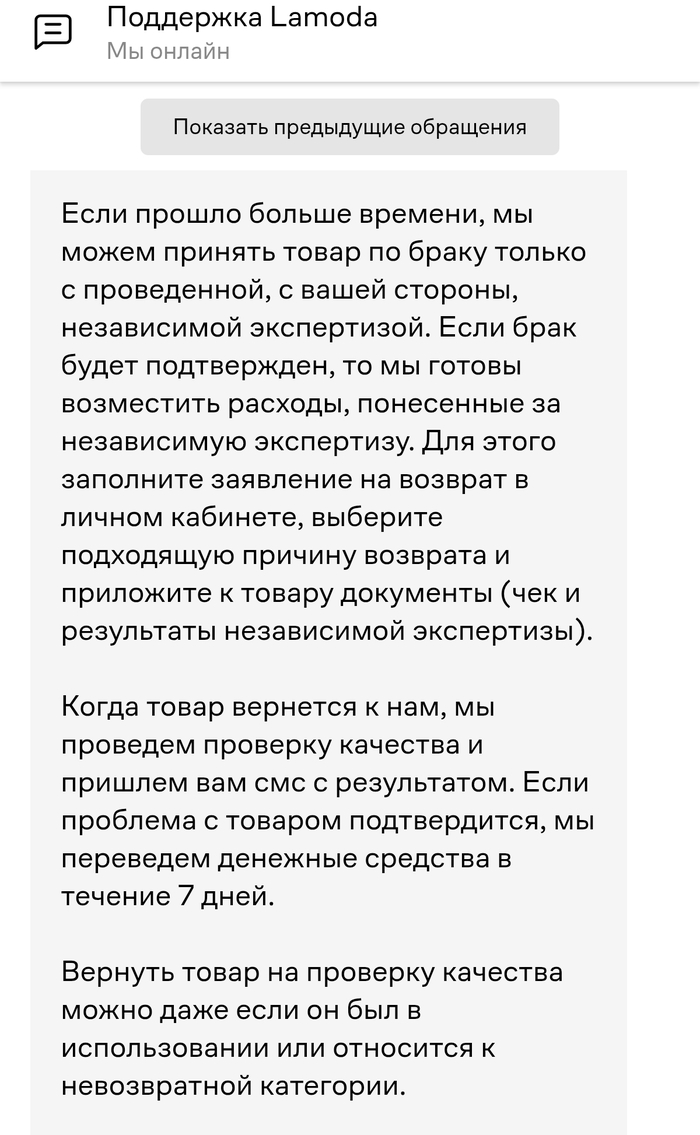 Решил оформить возврат ввиду низкого качества товара. Обратился в техническую поддержку, но получил следующий ответ. Меня удивляет необходимость проводить две экспертизы подряд: сначала я трачу средства на проверку своей пары, подтверждающую плохое качество изделия, а потом Lamoda проводит собственную проверку и заявляет, что вина лежит на мне. Таким образом, получается замкнутый круг без шансов на справедливое решение.