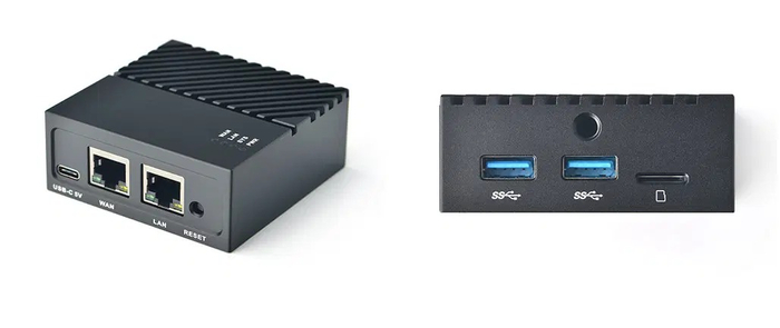 Мне удалось его успешно прошить и не окирпичить, но как оказалось версия OpenWrt, которая на нём работает - старый китайский форк, который сильно урезан по возможностям, многие пакеты из официальных репозиториев OpenWrt просто не поддерживаются. Помучившись недельку я понял что данный роутер не отвечает моим требованиям и стал искать другие варианты. Сначала думал просто купить более современный и мощный роутер, на который OpenWrt встанет без проблем. Однако нейросетевой друг подсказал мне другую идею: одноплатные мини-ПК. Существуют варианты специально заточенные под OpenWRT. Я остановился на модели NanoPI R4S, одноплатник размером с пачку сигарет, вот так он выглядит: