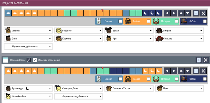 Тут все относительно просто - несколько смен с непересекающимися обязанностями, побольше сна и перерывов - за них дается бонус к моральному духу. И не забыть раздать совам работу по ночам. Кулинаров запихать в разные смены, чтобы кухня не простаивала, ибо производство еды, причем хорошей еды - одно из самых основных дел, о котором нужно беспокоиться.