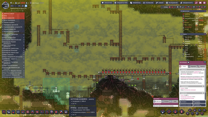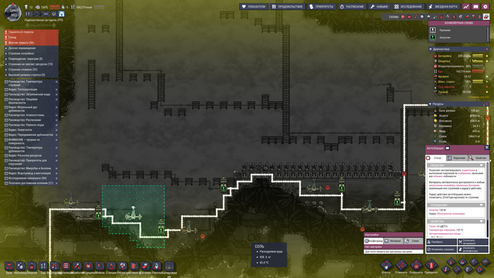Тащим "холодное" в базу, теперь можно выдохнуть и даже попробовать замутить тепличку с иглоцветами высотой 4 клетки))) Только после этого можно пробовать переходить в нефтянку, делать пластмассу, любую рельсовую автоматизацию и раскапываться дальше до космоса. Раньше я первым делом даже без экзокостюмов копал до космоса и делал туда "дымоход", не зная, что проблема углекислого газа отлично решается отделителями углерода, даже если угольные генераторы стоят непосредственно на базе. Пишу свои списки неочевидных мастхэвных строений при любом прохождении и того, что мне вообще не пригодилось.