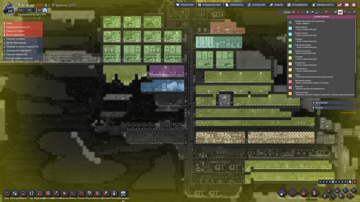 Ну вот я и добрался до самого главного и важного. Обычно советы от песочных градостроителей новичкам заканчиваются на "изучите первым делом агроклетку" (кстати, я с этим согласен) и "обязательно укажите направление для раковин" (и тут тоже согласен), чтобы дубли мыли руки только проходя в одну сторону от толчков к раковинам, но я же хардкорный выживастер и потому "вникайте и наматывайте". Перво-наперво что вам надо приучиться сделать это ставить игру на паузу перед любыми своими действиями, это запомните как "Отче наш". Раздали все команды, приоритеты, проверили что как и где - убрали паузу. Ну это самая банальная вещь из основного, дальше конкретнее.