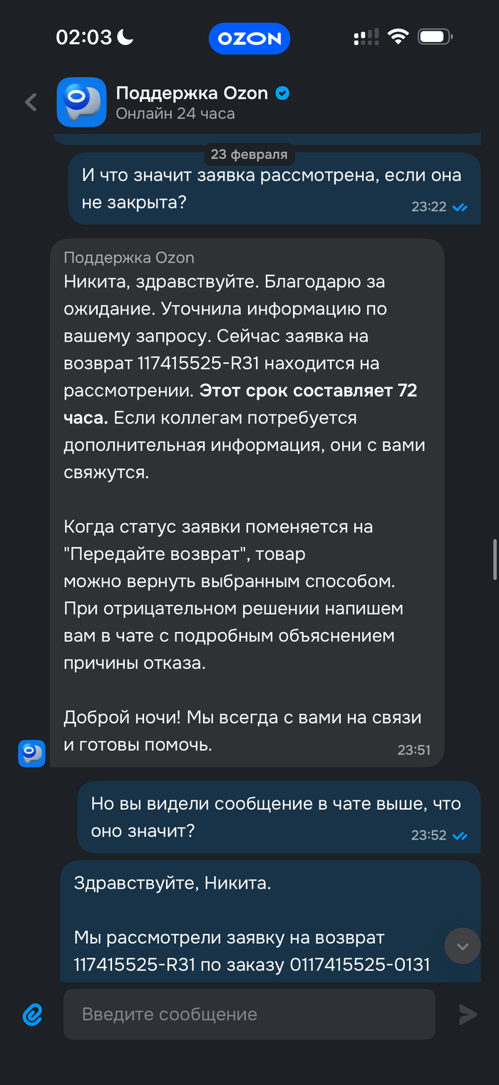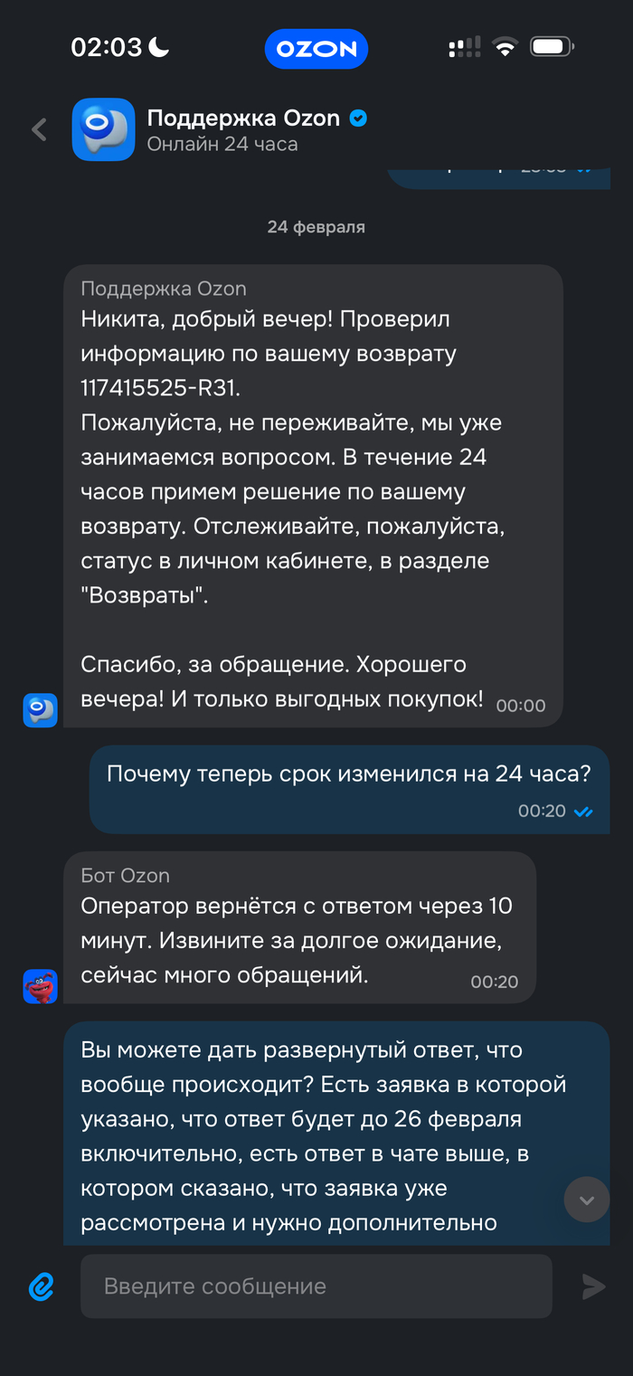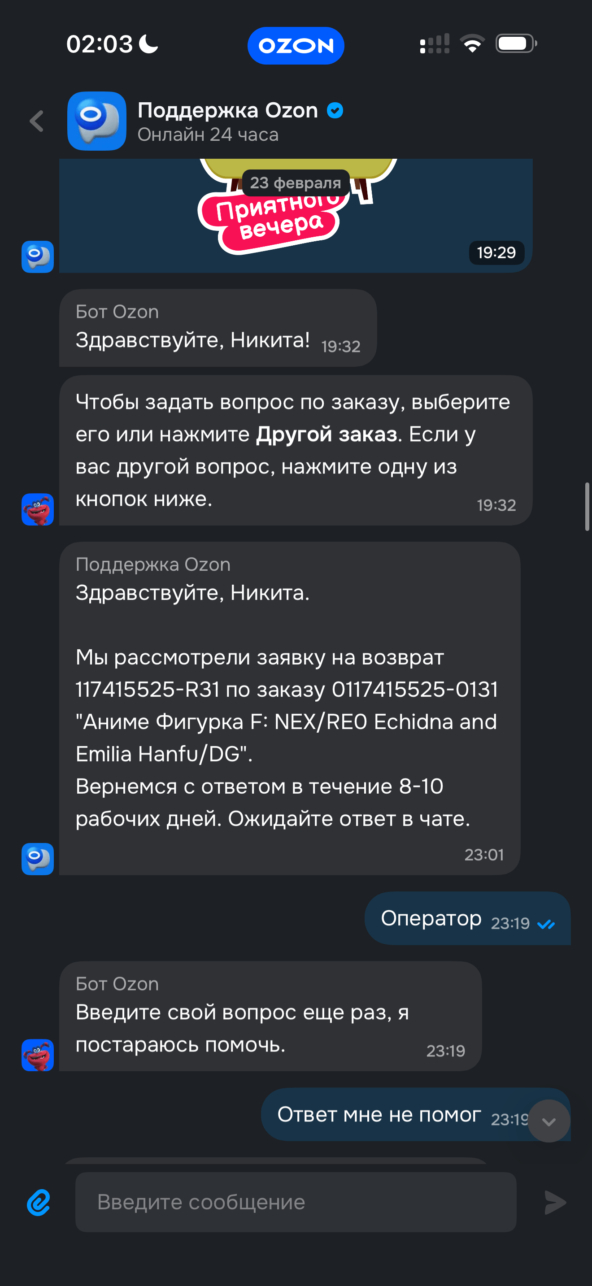 Обращение в чат технической поддержки Oзон с просьбой отменить заказ и вернуть деньги ни к чему не привело. Оператор ссылается на необходимость дополнительного ожидания в течение 20 дней с момента истечения первоначальной даты доставки. Требование мотивируют особенностями международной доставки и внутренними правилами Ozon, согласно которым отмена заказа возможна лишь в случае задержки посылки более чем на 20 дней от крайней изначальной даты доставки. Озон придумывают свои правила, которые идут вразрез с действующим законодательством.