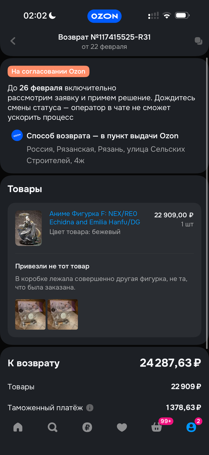 Опция «отменить заказ» в личном кабинете не работает, также невозможно отменить заказ и через чат поддержки Озон. Стоит добавить, что операторы мне ответили, что заказ можно аннулировать в пункте выдачи Озон или вообще не забирать. Представьте , я живу в городе, адрес пункта пункт выдачи находится в области, примерно в 170 км от меня и я должна туда поехать, чтобы мне отменили заказ. На это они предложили другой вариант: ждать ещё 20 дней ждать, когда товар доедет, а после этого ещё плюсом ждать 14 дней, когда не забранные товар автоматически отменят в ПВЗ.